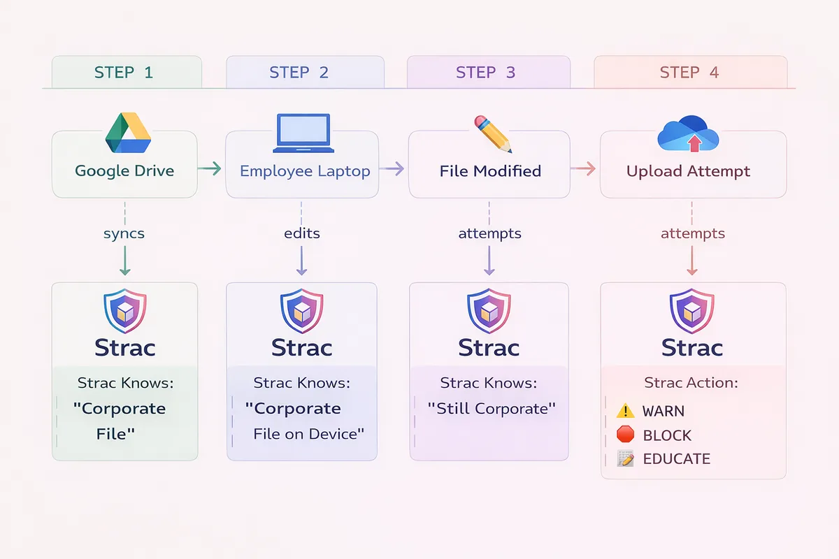 Strac identifies files downloaded from Box, Google Drive, OneDrive, and SharePoint — tagging them as corporate data the moment they touch an endpoint.