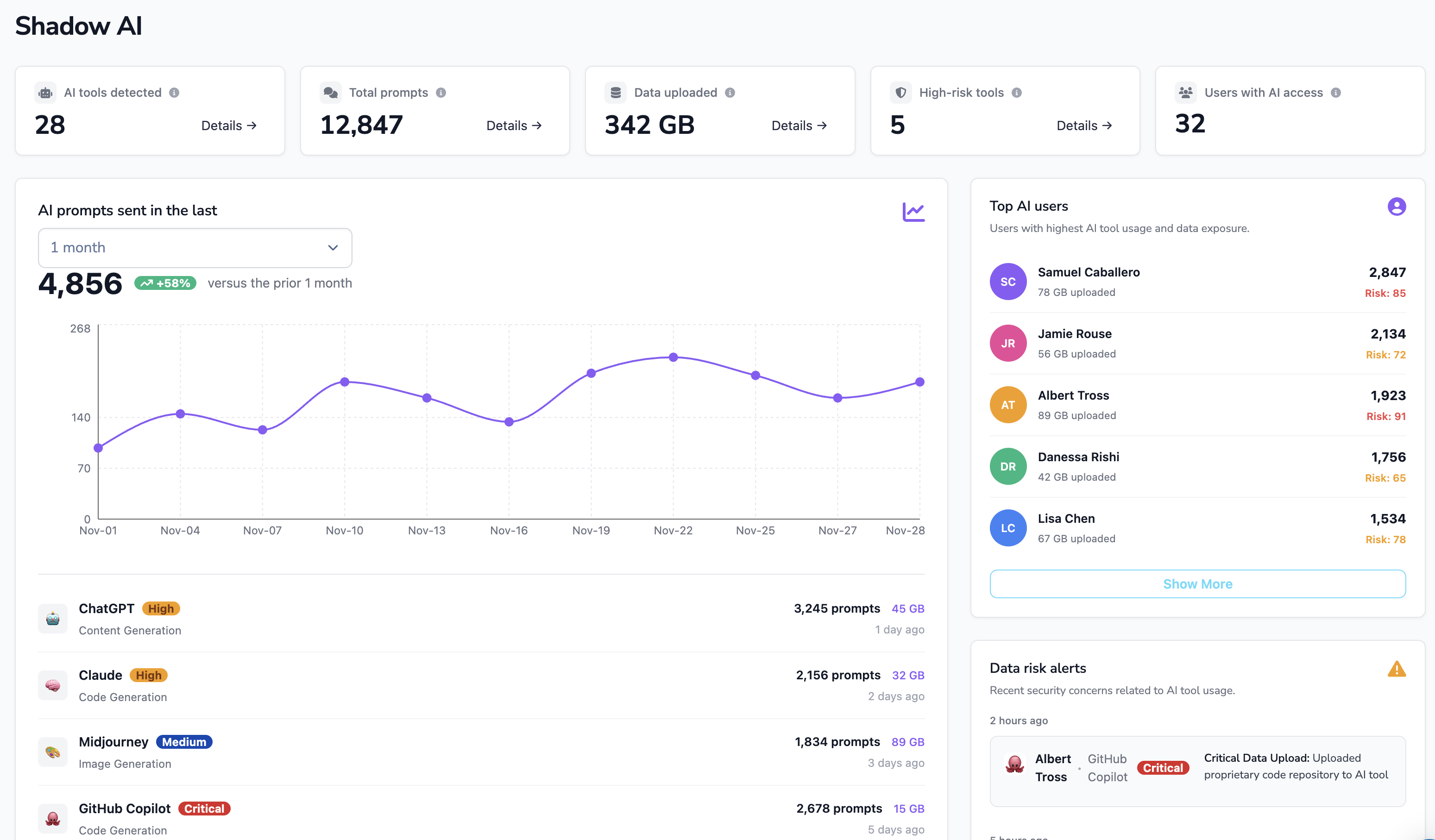 Automatically detects and blocks high-risk categories like Customer PII, API Keys, and Source Code (as seen in your dashboard).