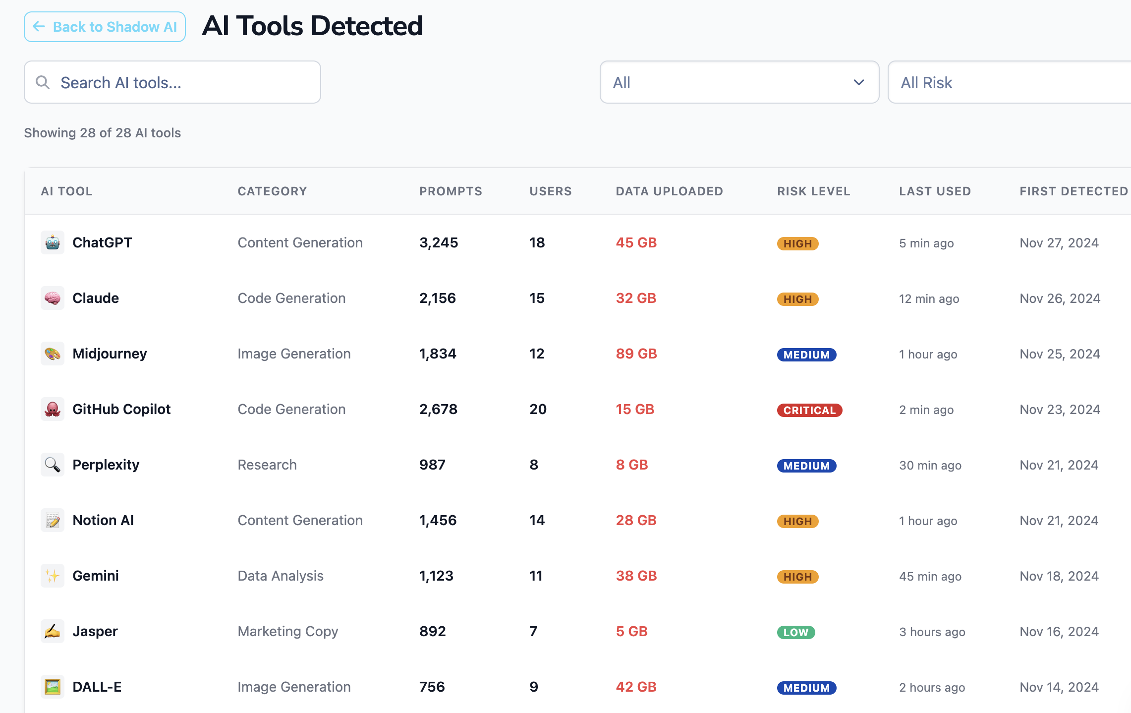 Spot which "High Risk" tools are in rotation and which users are bypassing corporate policy.