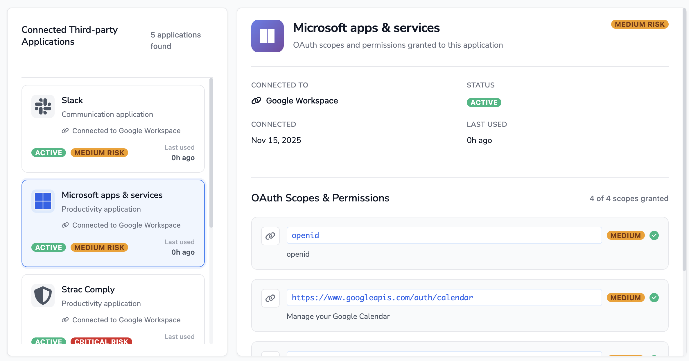 Instantly see which apps have "Critical" access scopes, like reading emails, managing calendars, or accessing Google Drive files.