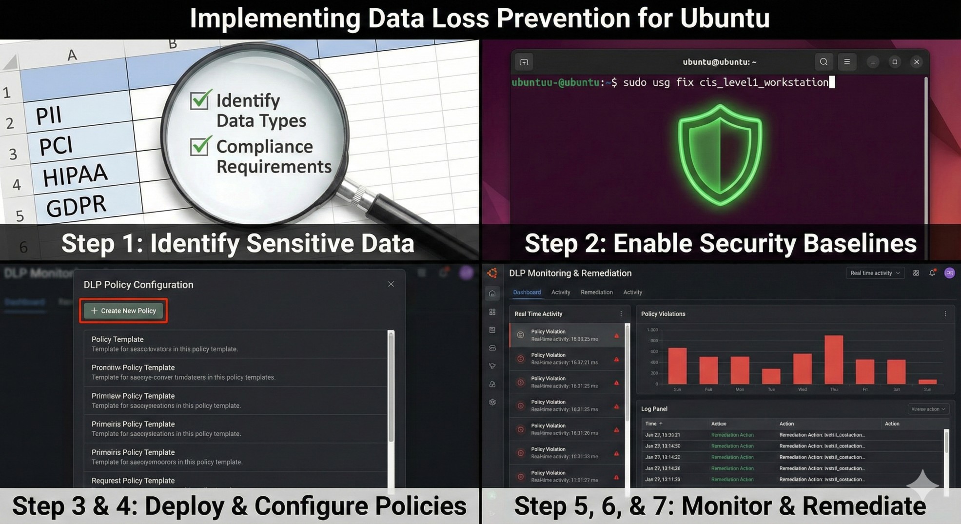 Implementing DLP on Ubuntu requires a structured approach that secures the device, monitors sensitive data, and enforces automated controls. Ubuntu does not include native enterprise-grade DLP features; therefore, organizations must combine OS-level hardening with a modern DLP platform that can classify and remediate data in real time. A step-by-step framework ensures consistency and reduces insider and external risks.