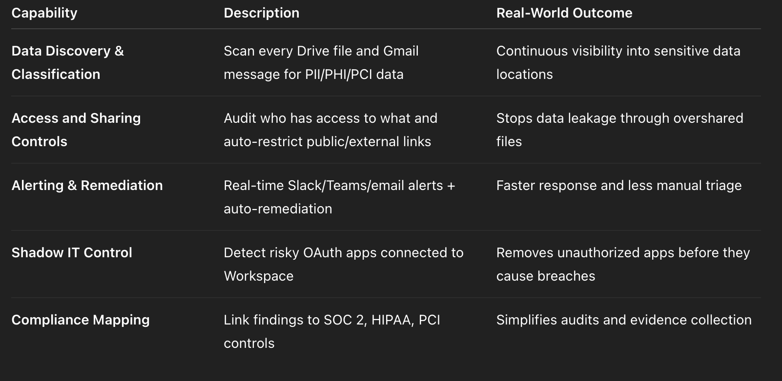 In the Google ecosystem, it’s the missing layer between users and Google services — ensuring that sensitive data isn’t accidentally exposed, maliciously shared, or left unmonitored.