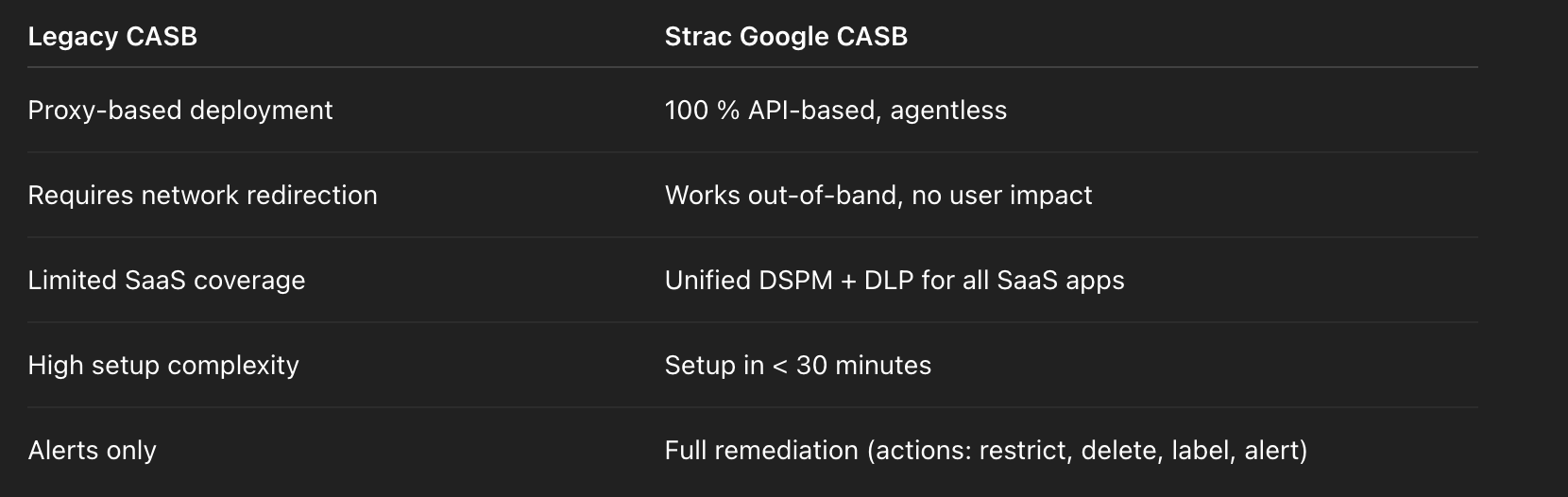 Those tools require network routing and agents. Strac uses direct Google APIs, so it deploys instantly, without latency or maintenance.