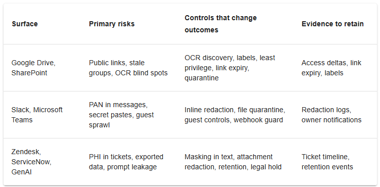 Your company runs on four streams today. Files, chat, tickets, and prompts. Each is fast. Each is social. Most leaks in SaaS are not exotic. They are public links that never expired, screenshots parked in chat, ticket attachments that carry exports, and GenAI prompts that echo customer data. SaaS DLP is how you see those risks early, remove exposure in place, and keep clean evidence for auditors.