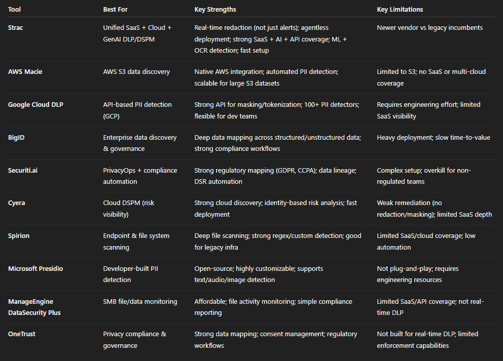 This table gives a quick, side-by-side look at popular PII scanning software, highlighting where each tool works best and where it may fall short, so you can quickly narrow down the right option for your needs.