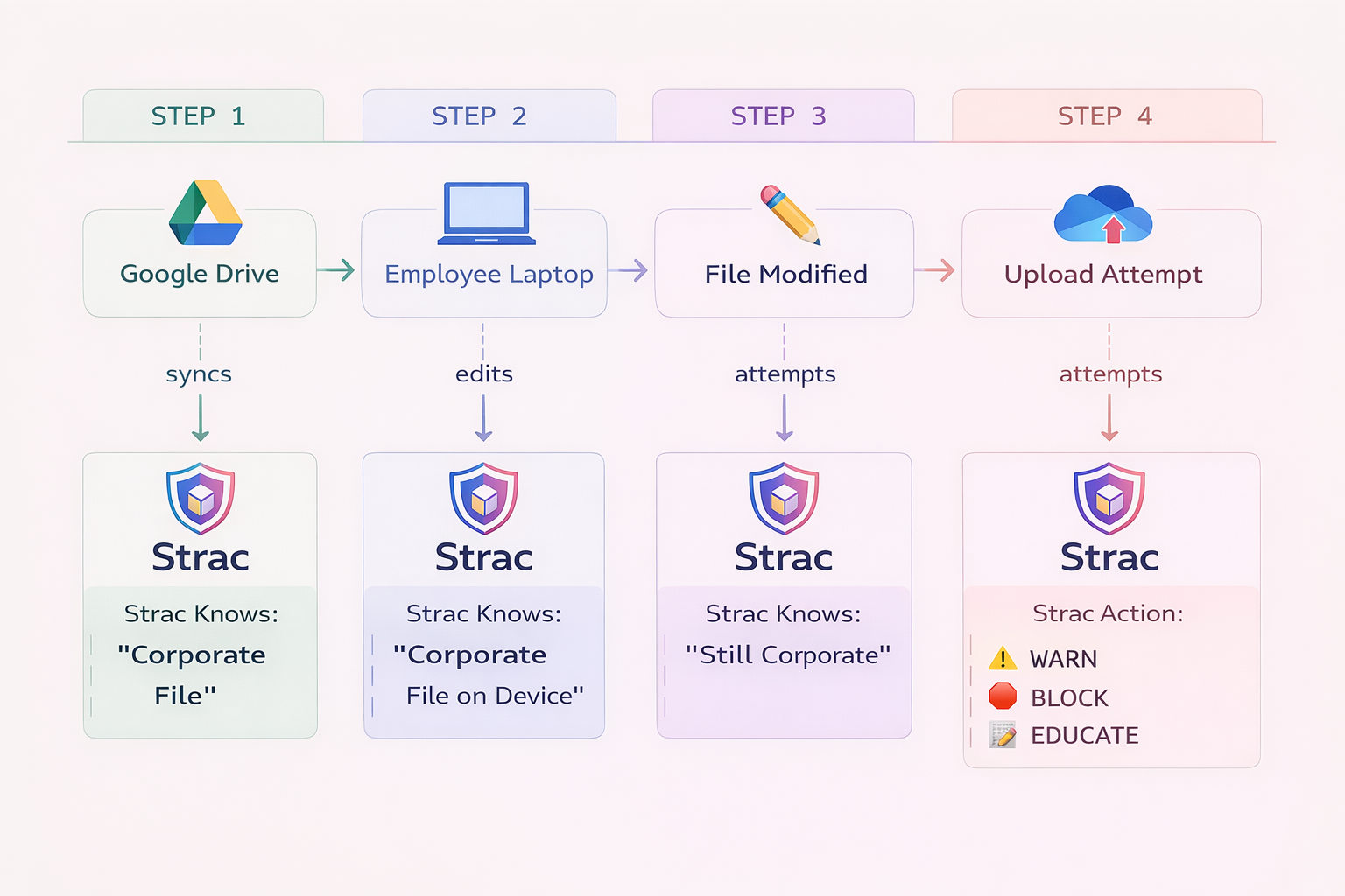 This unified architecture allows Strac to enforce consistent policies across Windows, macOS, browsers, and GenAI tools — without relying solely on brittle endpoint-only enforcement.